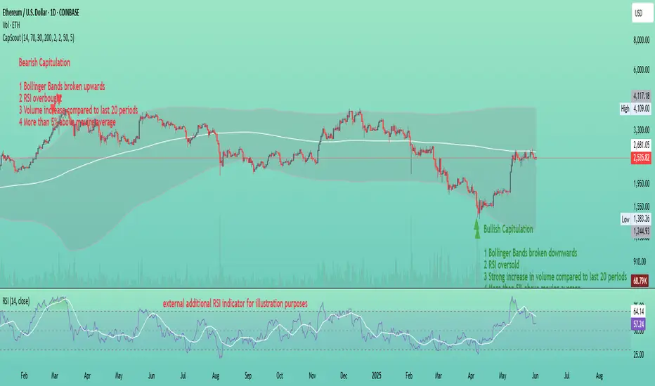 Capitulation Scout is a technical indicator designed to identify potential market reversals by detecting moments of "capitulation" – extreme fear (bearish capitulation) or euphoria (bullish capitulation). It uses two independent filter groups to generate reliable reversal signals: Extremes Filter (combining RSI and Bollinger Bands) and Confirmation Filter (combining Volume Spike and MA Deviation). Unlike traditional indicators that rely on single metrics, this script integrates multiple conditions to filter out noise and improve signal accuracy. The indicator dynamically adapts to chart timeframe, making it suitable for both day traders and long-term investors.