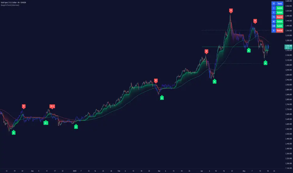 Signals are graded (Regular / Plus / Strong) based on contextual conditions, allowing traders to gauge the conviction behind each trend event. Range Candles add regime context by coloring bars only when a statistically consistent range structure forms, highlighting potential consolidation or transitional market phases. A lightweight Timeframe Scanner completes the workflow, broadcasting alignment from intraday to daily without adding chart clutter.