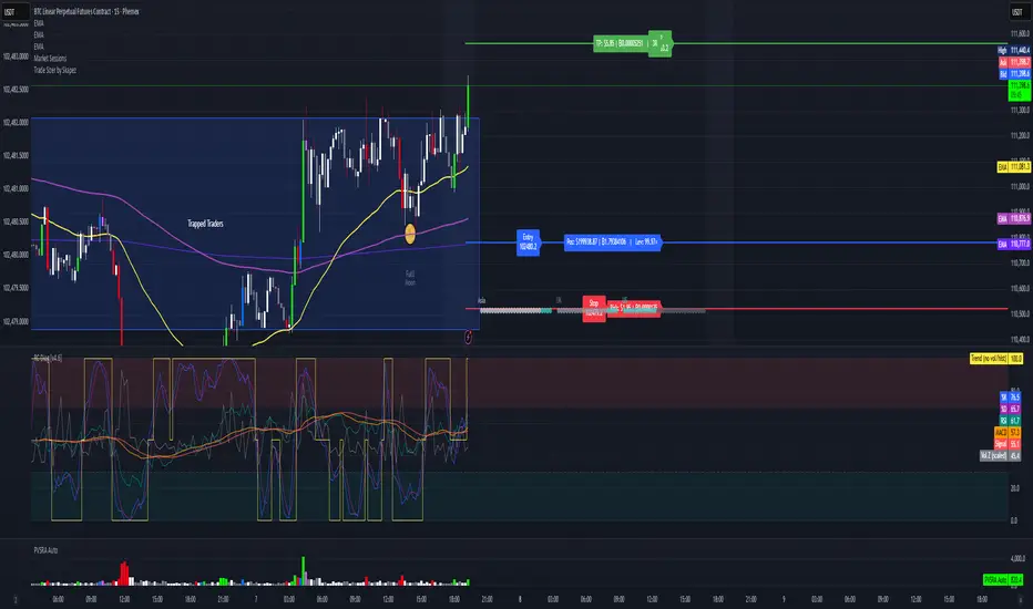 It plots Entry / Stop / TP lines, sizes your trade to a fixed % risk (e.g., 2%), calculates leverage, and shows clean labels (Risk $, TP $, Position $, Leverage ×). You can ARM a setup, drag the lines to fine-tune, and (optionally) trigger alerts for webhooks.