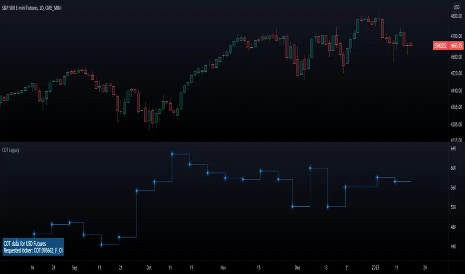 This indicator displays the Commitment of Traders (COT) legacy data for futures markets.