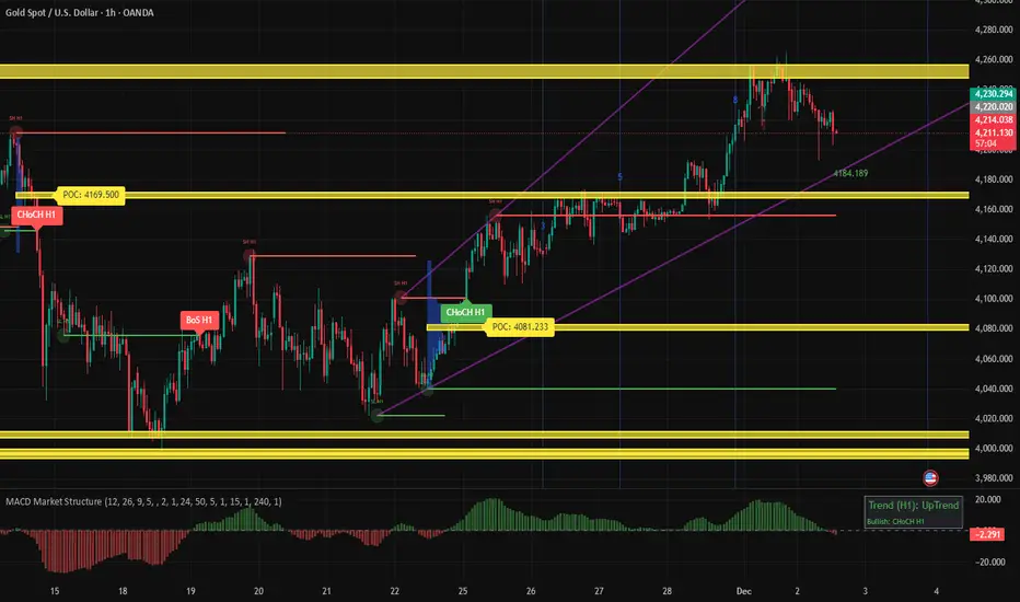 This script offers a unique approach to Market Structure by moving away from traditional fractal-based highs and lows (which can be noisy). Instead, it utilizes **MACD Momentum Swings** to identify significant structural points, combined with an automated Fixed Range Volume Profile to pinpoint high-probability entry zones.