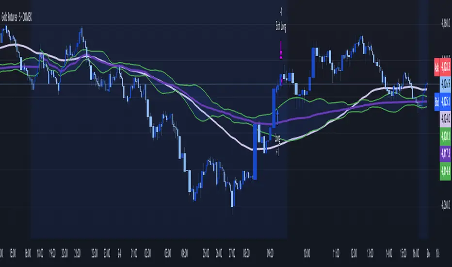 Daily Profit/Loss Limits: If the running total of Realized PnL (closed trades) + Unrealized PnL (open position) exceeds a user-defined Daily Take Profit (in Ticks) or falls below the Daily Stop Loss (in Ticks), the strategy locks out new trades and immediately closes any open position.