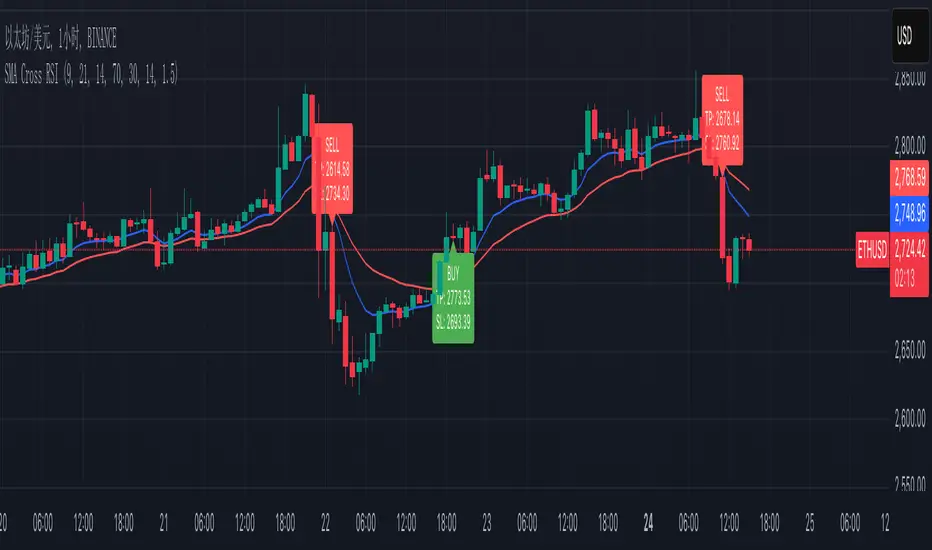 The indicator incorporates RSI (Relative Strength Index) to confirm the buy and sell signals generated by the moving average crossovers.