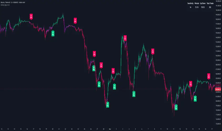 Adaptive Signals: Introduced a new "AI" signal mode (Show Signals Type input). When selected, the indicator dynamically adapts its core parameters based on machine learning analysis of recent market conditions.