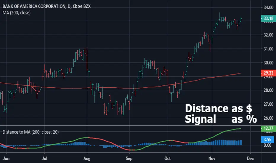 The indicator now has the ability to show distance and signal as a percentage from the moving average.Quadrant top left shows distance and signal line from the MA in terms of dollar amount.