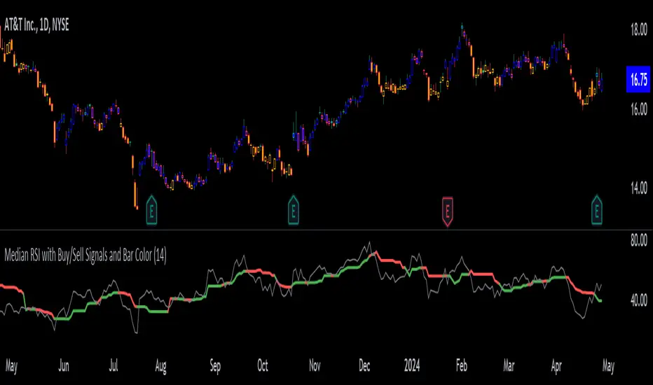 The "Median RSI with Buy/Sell Signals and Bar Color" indicator on TradingView calculates the median Relative Strength Index (RSI) alongside buy and sell signals and customizable bar colors. RSI is a momentum oscillator that measures the speed and change of price movements. This indicator provides traders with insights into the relative strength of a security by comparing its recent gains to its recent losses.
