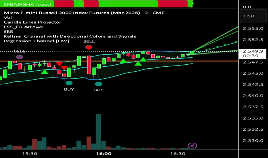 This script uses the previous and current candles wicks and top and bottom of candle bodies to project direction at any given moment. It connects upper and lower wicks and candle bodies and projects forward as well. I think of the upper wicks as sells/resistance and the lower ones as buys/support. Same with the candle bodies. I personally use it to scalp and wait for say resistance on a chart, then rather than just selling the level I will short when all the lines turn down/red. it It's just part of a system with other correlation and indicators etc. For me it's easier than looking at the candles for these signals. it's direct graphic direction projection. Use at your own risk of course. It's meant to be used within and complement a broader system