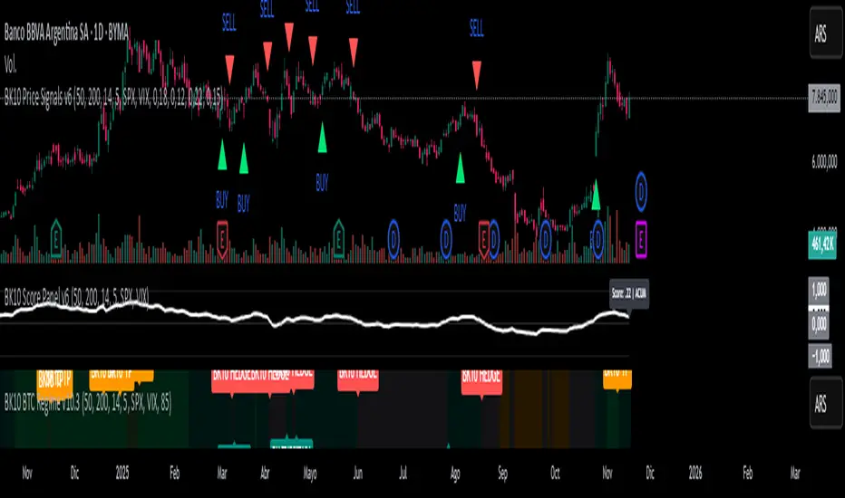 BK10 v10.3 is a regime map designed to show at a glance where the market is: from CRASH/STRESS to EUPHORIA. It combines trend (50/200 EMA), momentum (RSI), and optionally, macro context (SPX + VIX) to classify each candlestick into 6 states: