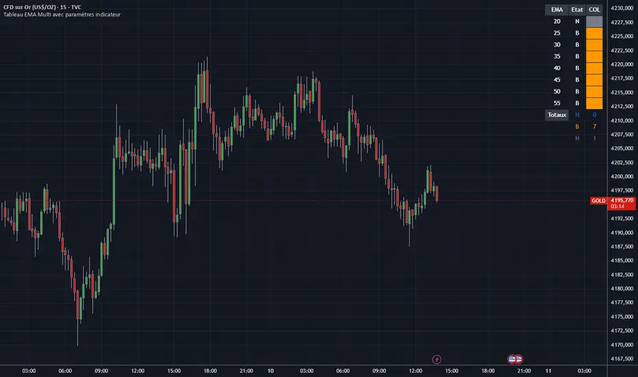 Trend Confirmation: Use the "Totaux" (Totals) counter at the bottom of the table. If you see 8/8 H (Blue), the bullish trend is strong and aligned across all timeframes (short and medium term).