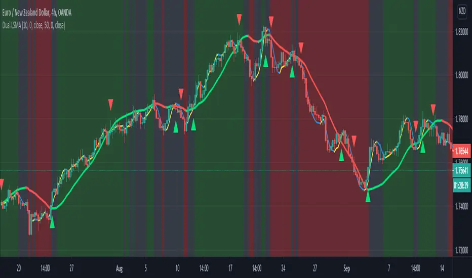 - Background color change based on the slope of the slow moving average (LSMA 2).