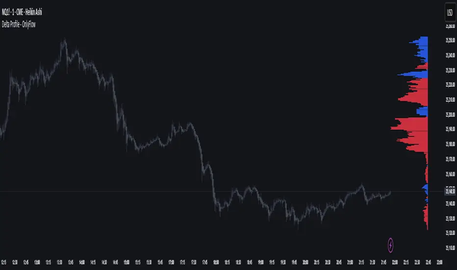 This script plots a horizontal profile of trading activity based on a chosen lookback window. It can be displayed either as a Volume Profile or as a Delta Profile: