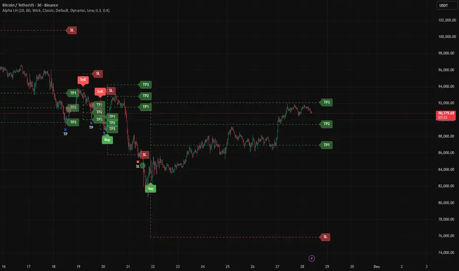 It also offers dynamic risk management tools like adaptive take-profit and stop-loss targets based on ATR, as well as visual entry/exit labels for clearer decision-making.