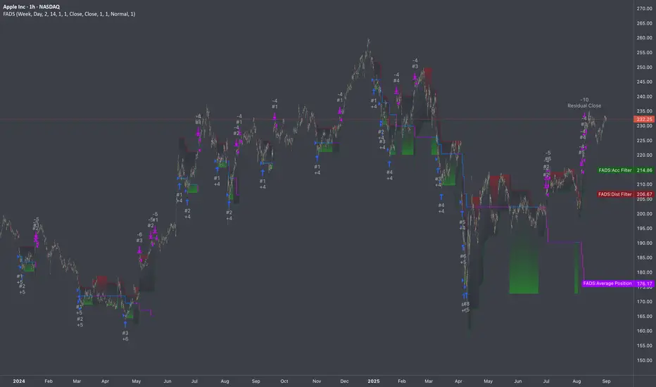 The FADS trading strategy combines volatility-based trend detection and adaptive position scaling to maximize profitability across varied market conditions. By using the price ranges from higher timeframes, FADS pinpoints extreme demand and supply zones with a high statistical probability of reversal, making it effective in both high and low volatility environments. By applying adjustable threshold settings, users can focus on meaningful price movements to reduce unnecessary trades. Adaptive position scaling further enhances this approach by adjusting position sizes based on entry level distances, allowing for strategic position building that balances risk and reward in uncertain markets. This systematic scaling begins with smaller positions, expanding as the trend solidifies, creating a refined, robust trading experience.