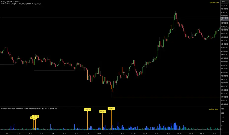 Golden Volume — Lines is an advanced volume-based indicator that detects Ultra High Volume candles using a statistical percentile model, then automatically draws and tracks key price levels derived from those candles.