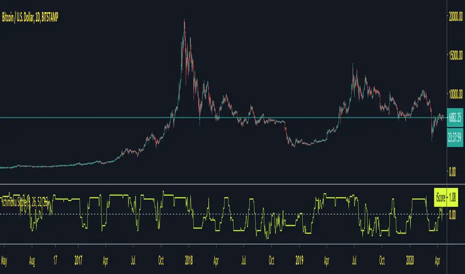 iScore, is an Ichimoku-based scoring system, in which individual Ichimoku events are measured by their impact, and then counted towards a greater score, leaning either bullish or bearish. The score tends to be between -3 and 3 for 99% of occurrences. Scores above or below this range are abnormal to say the least.