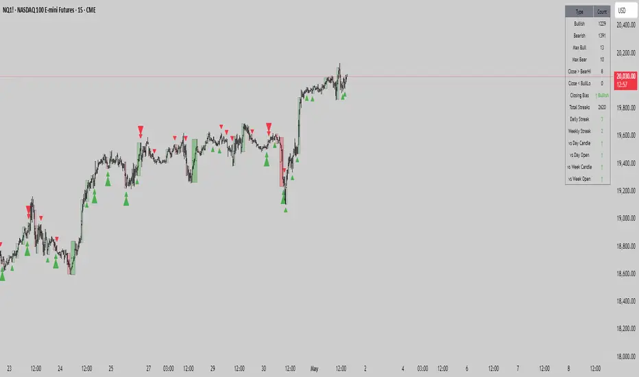Added a table that will track the streaks, and added a bias filter based on your look back period and if were closing above or below. Added the option to anchor boxes to the open and close of streaks. cleaned up the strict swing and ultimate signals so if the both trigger on a bar only the ultimate signal will show. added a gap pattern that is a bullish bearish bullish or bearish bullish bearish with a gap between the bodies. And i think thats it lol. Let me know how you use it or if you have any suggestions. that straters should love this because many of the signals lead to 2's in a direction. ill make a video at some point to give a better explanation of this indicator and how i use itRelease Notes