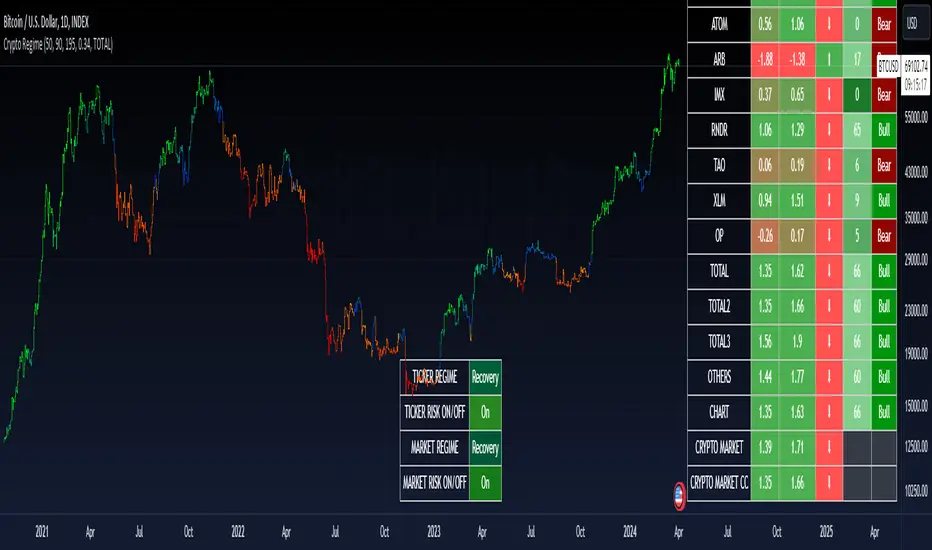 This Pine Script indicator, titled "Cryptomarket Regime," aims to analyze the current market regime of the cryptocurrency market by considering various factors such as correlation, z-scores, and exponential moving averages (EMAs) for trend classification.