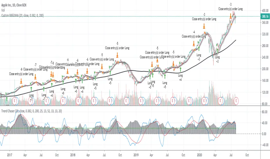 The strategy utilizes the 200 Moving Average, a Custom Bollinger Band, a TSI with 52 period weighted moving average and ADX strength.
