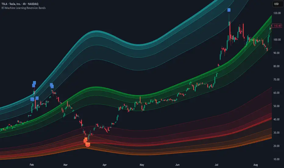 This version retains the original red and green Reversion Bands and adds a second set of dynamic Machine Learning Bands that adapt to volatility. This gives the trader four levels to reference: