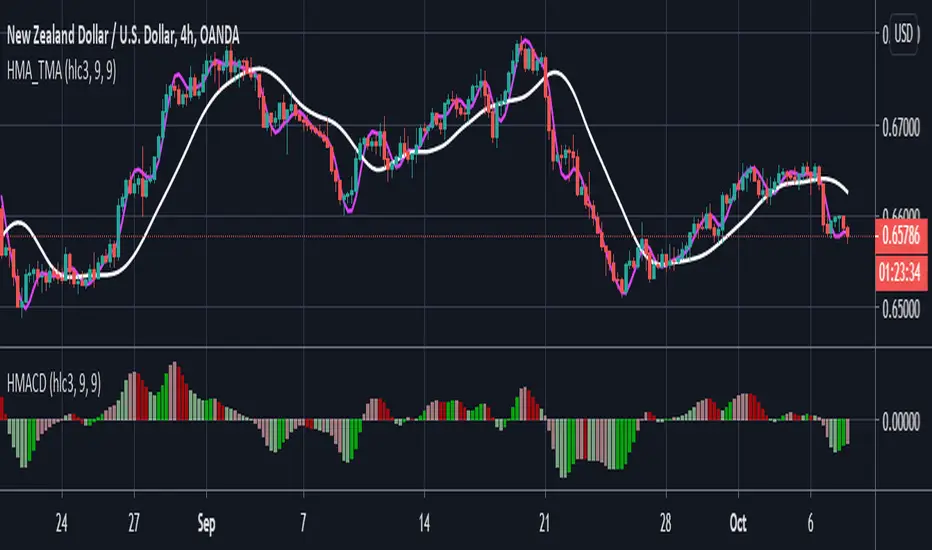 HMA overshoots while TMA lags, producing an interesting MACD even when the two MAs have the same period.