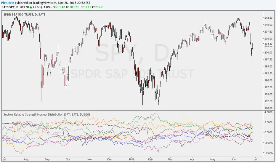 I wrote this indicator as an attempt to see the Relative Strengths of different sectors in the same scale, but there is also other ways to do that.