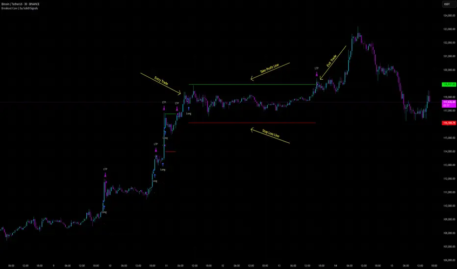 The chart is clean and intuitive, displaying only Breakout Core’s buy and sell signals for easy interpretation. Parameters are pre-optimized for immediate use, with adjustable Take Profit (TP) and Stop Loss (SL) levels. Traders should validate custom settings via TradingView’s backtesting tools to ensure market compatibility. An integrated Alarm Panel supports API connectivity, providing clear Entry/Exit commands for Long and Short positions, enabling seamless automated trading workflows.