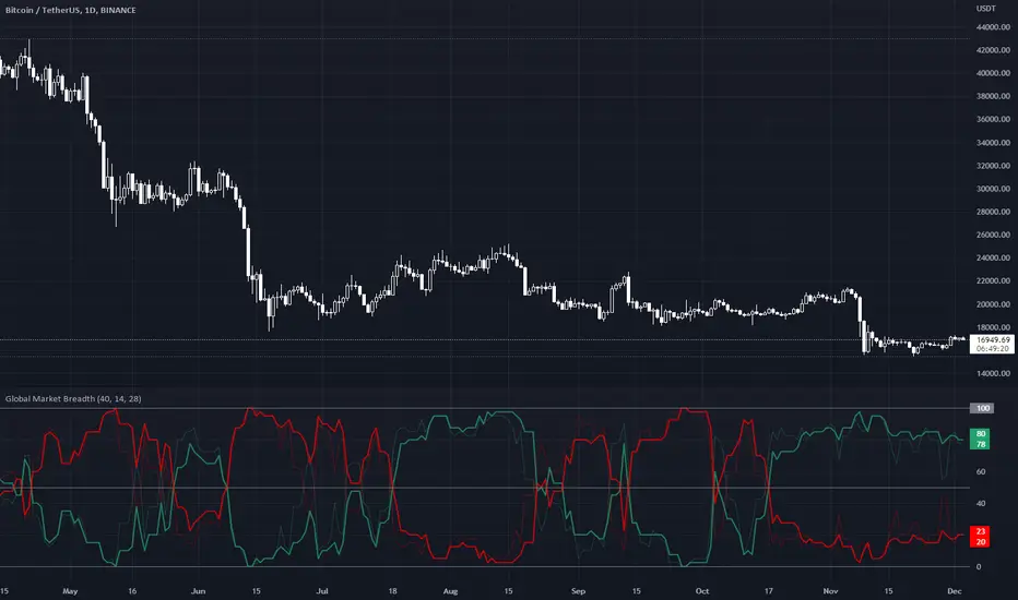 The percent of top market indices, from stock exchanges around the world, advancing and declining. Whether the index is advancing or declining is determined by whether it closes above or below its moving average.