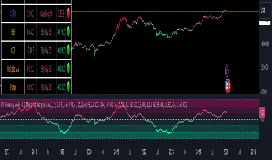 Z-Score Synthesis: By converting each indicator's value into a Z-score, we normalize their contributions. The average of these Z-scores provides a refined signal, indicating whether Bitcoin is in an overbought or oversold state relative to historical norms.