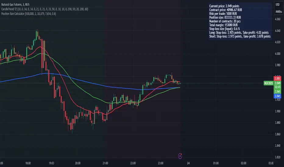 This TradingView script is specifically designed for traders working with futures on the Moscow Exchange. Its primary purpose is to help traders quickly and accurately calculate position parameters, such as the number of contracts, risk per trade, total margin size, and stop-loss and take-profit prices.