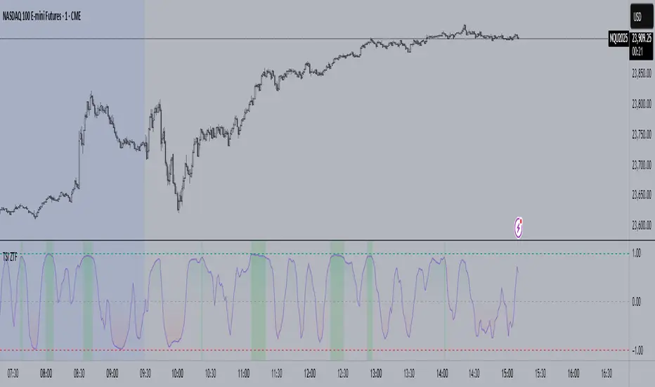 ZTF Modification: Added a green background highlight that appears when TSI reaches 0.90 or above, providing a visual alert for extremely strong bullish trend conditions.