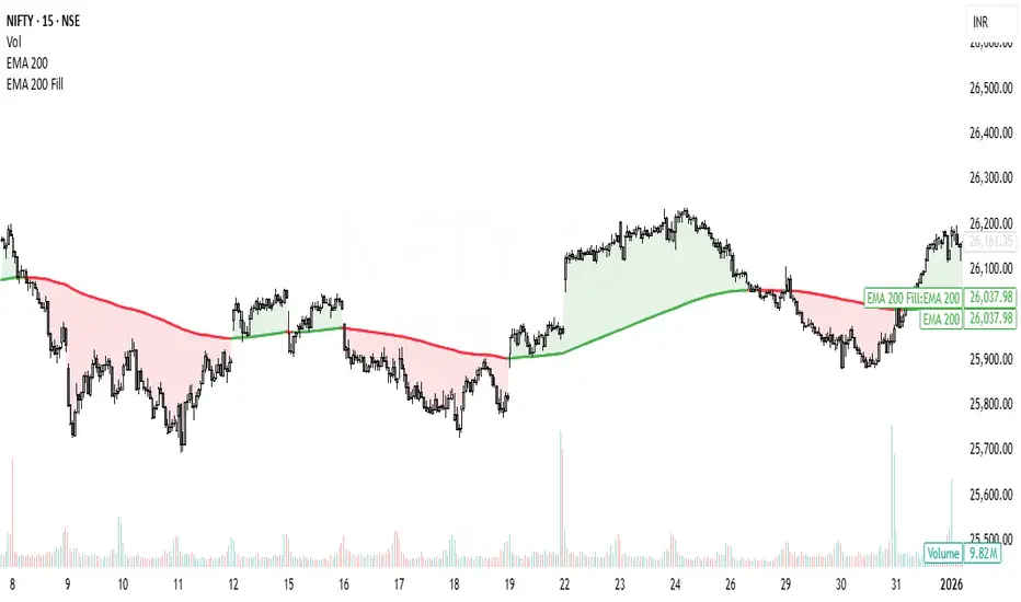 EMA 200 Color Change show the trend for price, if green with green shade then trend positive and if red with red shade then we assume trend is negative.