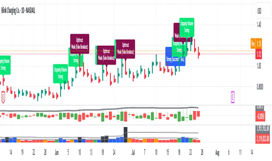 This script provides a full Volume Spread Analysis (VSA) toolkit to detect and label strength and weakness signals on the chart based on candle spread, volume, and close position.