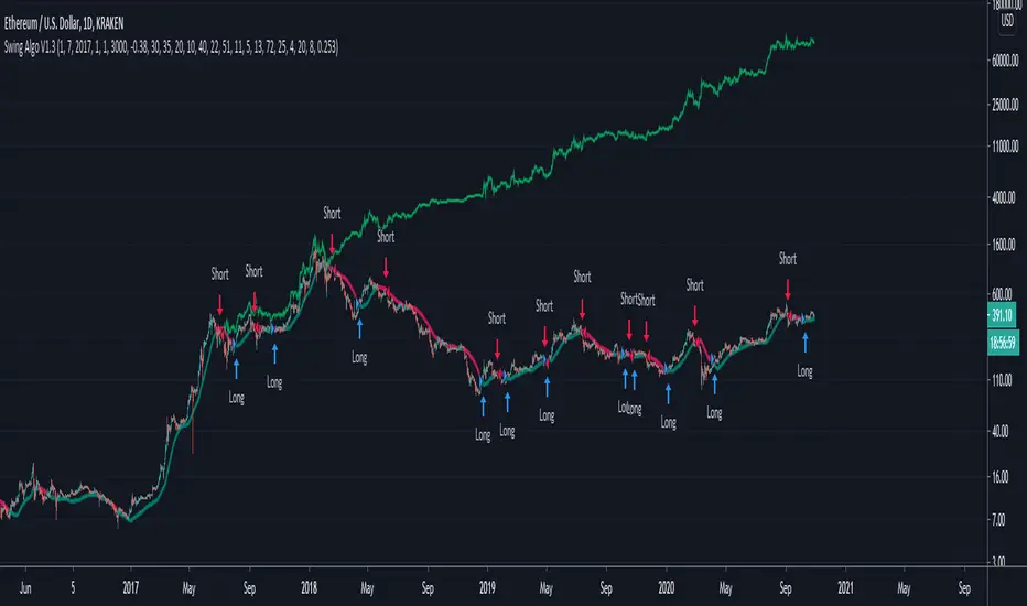 This indicator can be used for e.g. swing algorithmic trading. It will give Buy/Long and Sell/Short signals on the chart. This algorithm uses a combination of several (custom) functions and rules to find good entry points for trend trading. After many iterations and tests I came up with this particular setup, which is highly optimized for the ETH/USD trading pair on the daily (D) timeframe. Attention was also paid to stability, as all parameters are set onto plateaus, so that smaller changes in the characteristic price action should not affect the efficiancy too much. For other assets and/or timeframes it is however possible to change algorithmic parameters within the indicator settings to tune this swing algorithm. You don't need any programming skills or similar abilities to navigate this indicator.