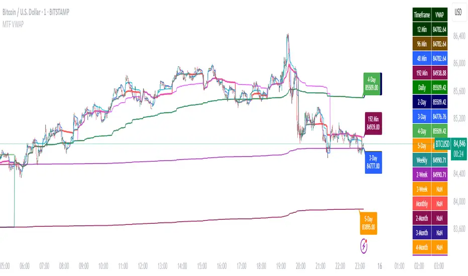 - Calculate VWAP across **12-minute, 48-minute, 96-minute, 192-minute, daily, weekly, monthly, and even yearly timeframes**.