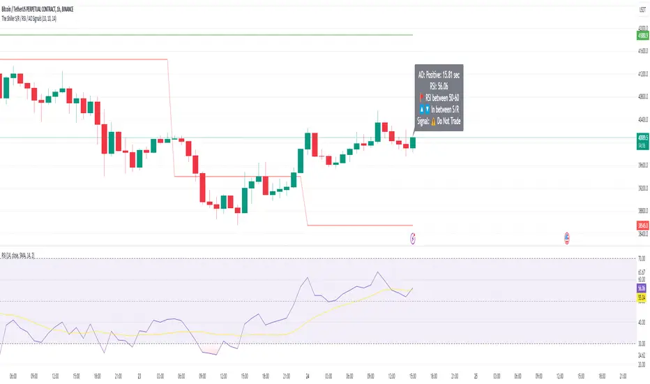 Elegant and Informative Display Panel: One of the script's most striking features is its display panel. Positioned unobtrusively on the chart, this panel presents real-time updates of the RSI, AO, and their positions relative to the S/R levels. This efficient summarization provides a snapshot of market conditions, all at a glance.