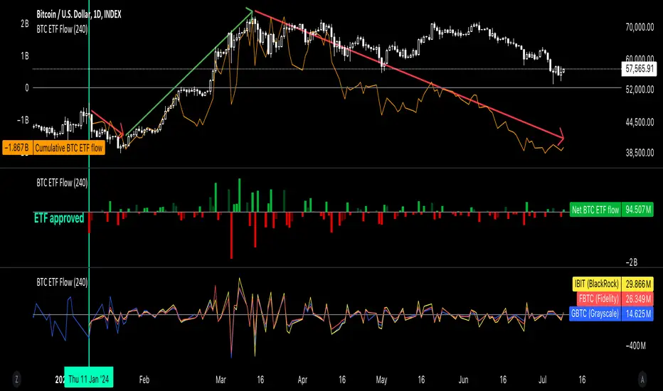 1. Total Cumulative Flow of the 8 biggest US BTC ETFs (top pane),