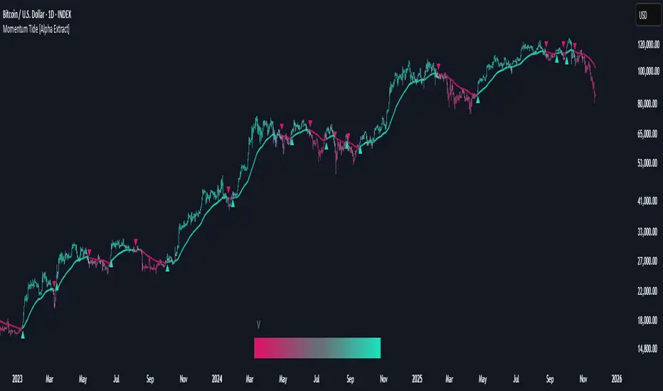 This indicator delivers sophisticated momentum-based trend analysis through normalized deviation measurement and intelligent three-state classification. Unlike traditional momentum oscillators that operate in separate windows, Momentum Tide integrates directly with price action through baseline overlay and candle coloring while providing the analytical depth of bounded momentum measurement. The system's combination of tanh normalization, configurable neutral bands, dynamic color intensity, and innovative strength meter makes it essential for traders seeking adaptive trend-following approaches with clear visual feedback across cryptocurrency, forex, and equity markets. The three-state system naturally filters ranging periods while the momentum strength measurement enables position sizing and confidence assessment for systematic trading strategies.