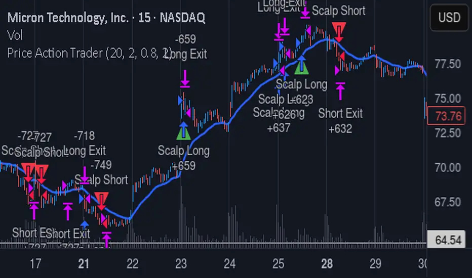 Trades are only taken in the direction of a fast EMA (default: 13-period) plus momentum bias using price vs. previous close.