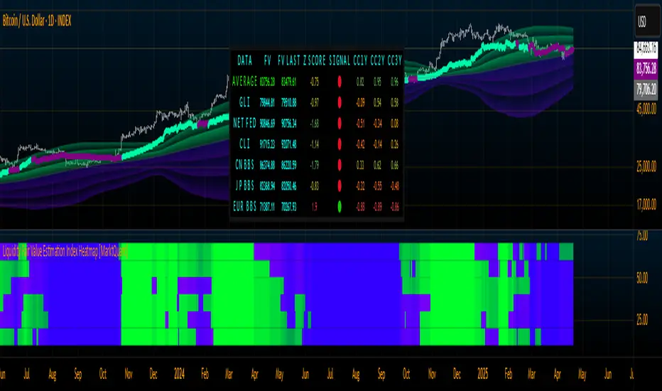 The Liquidity Fair Value Estimation Index Heatmap by MarktQuant is a TradingView indicator that analyzes global liquidity’s impact on asset prices, presented as a non-overlay tool. It estimates fair value based on macroeconomic liquidity data and visualizes deviations through a heatmap or Z-score display.