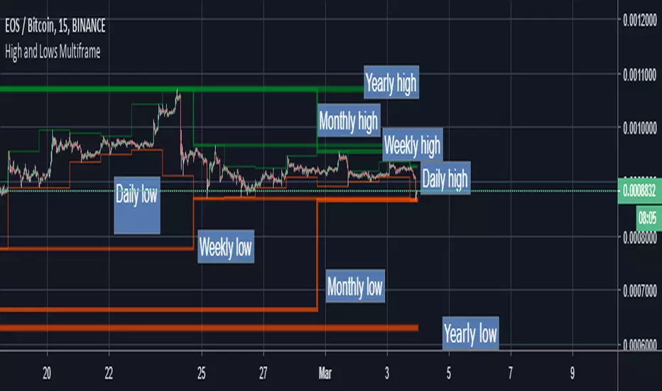 This script displays highs and lows from higher timeframes into the chart. Recommended to use Weekly or more lines on smaller timeframe charts like the 5M charts.