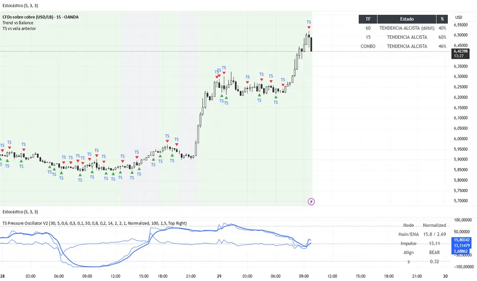 This indicator is a TS Pressure Oscillator. Its job is to turn a lot of small “TS events” (liquidity sweeps + rejection) into a single, easy-to-read curve that helps you spot short-term exhaustion and possible trend shifts.