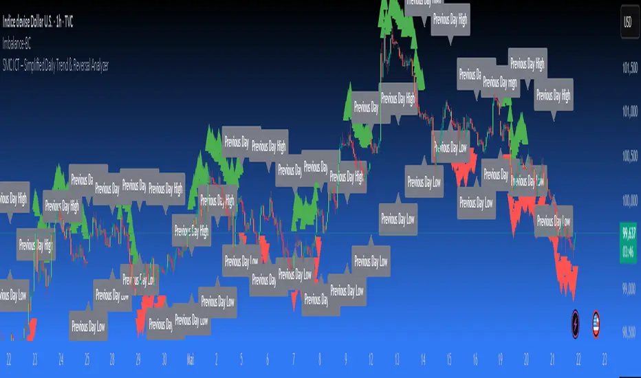 This Pine Script provides a simplified approach to analyzing daily trends and potential reversals using concepts inspired by Smart Money Concepts (SMC) and ICT (Inner Circle Trader).