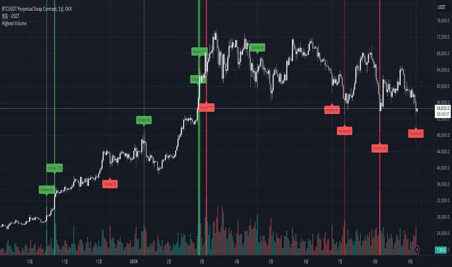 이 지표는 다양한 기간 동안의 최대 거래량을 시각적으로 표시하여 거래자들이 중요한 거래량 패턴을 쉽게 식별할 수 있도록 도와줍니다. 30, 60, 90, 120 캔들 기간 동안의 최대 거래량을 감지하고, 이를 차트 상에 색상 코드로 표시합니다.
