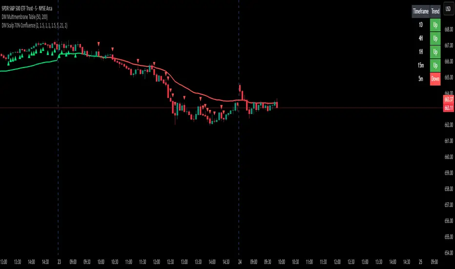 DM Scalp 70% Confluence indicator is a signal generator, not an automated strategy. That means it plots visual cues (triangles) to tell you when conditions are favorable for a scalp trade, but you have to enter the trade manually.