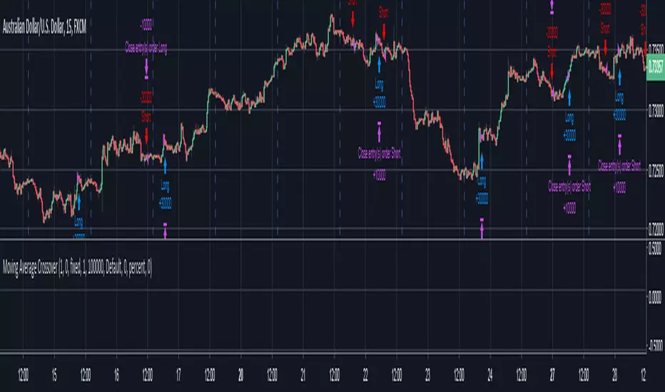 This is a simple moving average cross over strategy designed to get you familiar with writing strategies in pine script