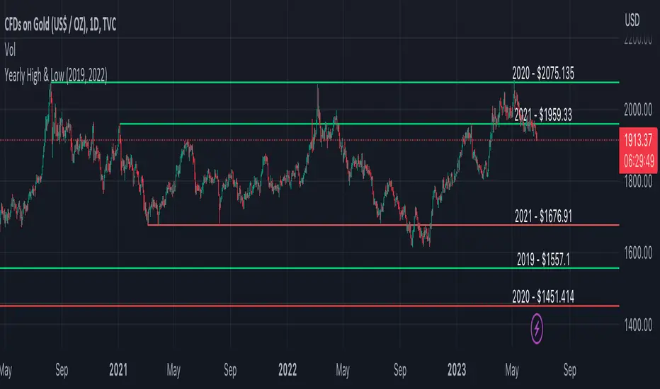 The "Yearly High & Low" indicator shows the yearly high and low prices on the chart, providing you with key price levels for each year. It helps you identify significant price ranges and potential support and resistance areas.