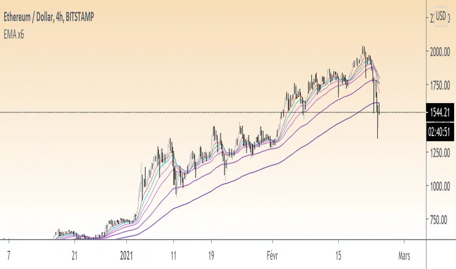 This is an update of my first and usefull script MULTI EMA. Now you can plots 6x EMA, base values are :