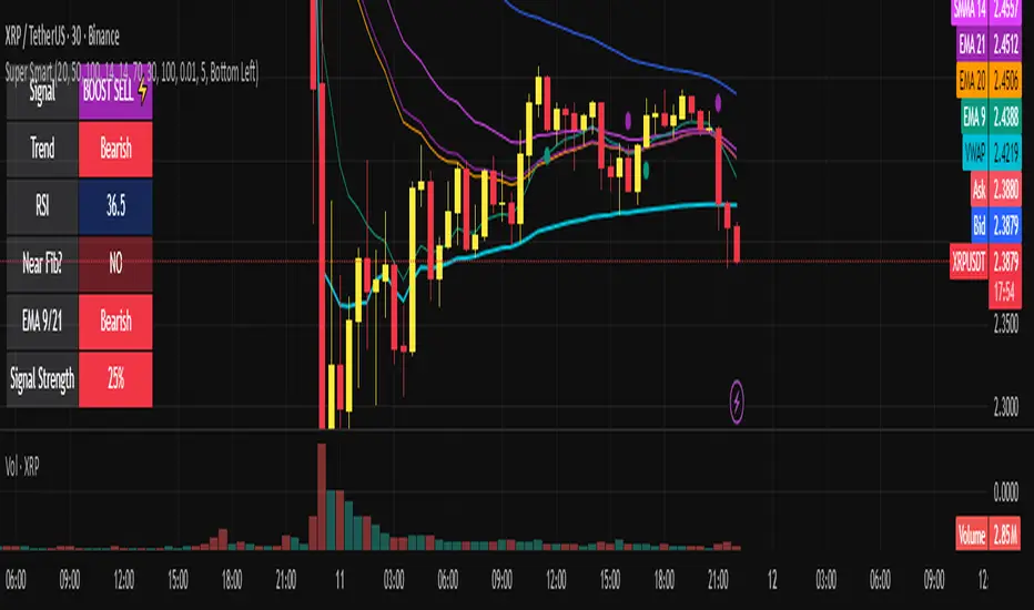 | **Super Smart Sell** | Bearish trend (EMA20 < EMA50, price < VWAP), price below SMMA, RSI or EMA cross or SMA cross, near Fib level |