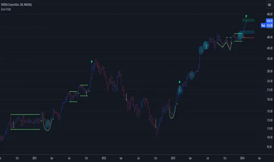 The Base Finder is a powerful tool to identify consolidation periods in a stock's advance. With this indicator, traders can effortlessly spot consolidation patterns on their charts providing them with a deeper understanding of the stock's price action.