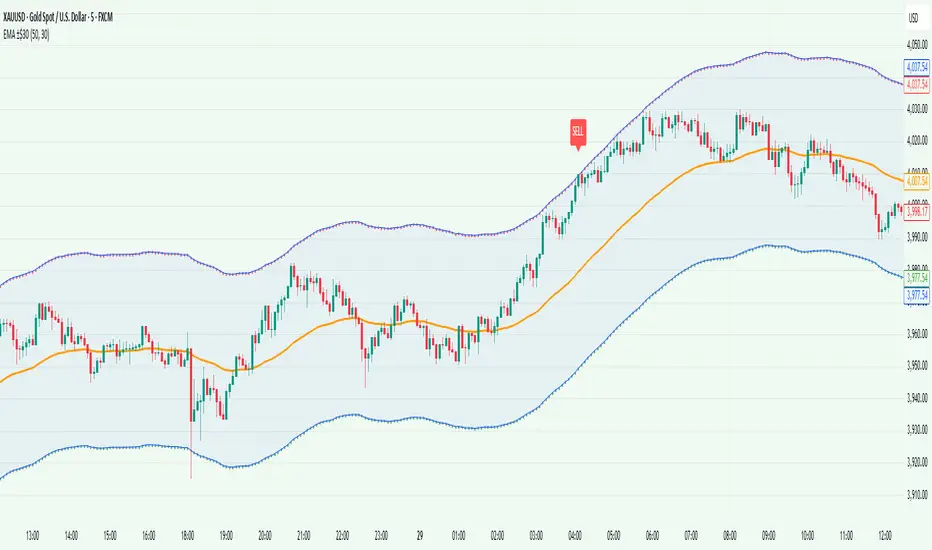 This indicator works absolutely perfect on Gold (XAUUSD) on 5 min timeframe. Wait until price deviates up or down at least $30 from 50EMA and keep adding until $40, it will eventually comes back to 50EMA as a magnit and most of the times moves back $20-30 towards profit.